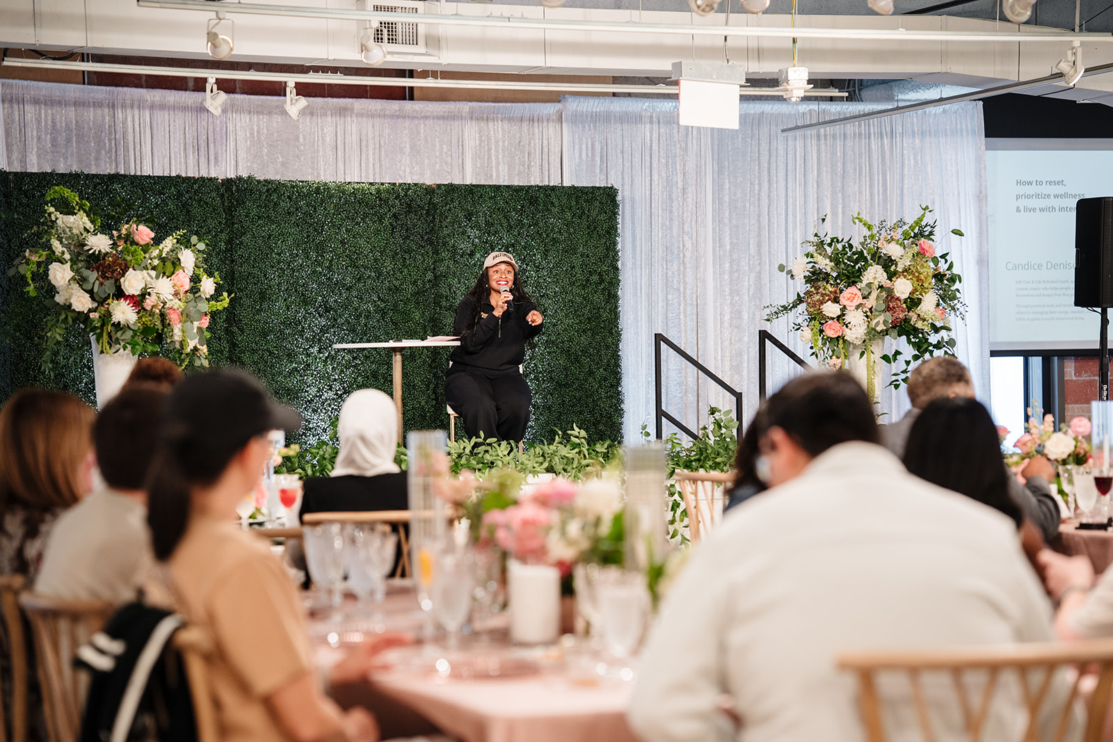 Guests arrived for a morning of connection beginning with wellness activations beautifully designed by MK Events. From sugar scrubs to calming eye massages, each activation reminded attendees of the importance of taking time to recharge. The elegant space at Fashion Industry Gallery offered the perfect backdrop, combining natural light and modern design for a serene start to the day.